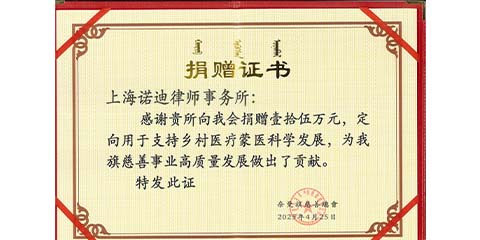 为积极响应“健康中国”基本国策,上海诺迪律师事务所向内蒙古通辽市奈曼旗慈善总会捐赠壹拾伍万元,用于支持乡村医疗蒙医科学发展,提升医疗服务水平,解决群众急难愁朌。